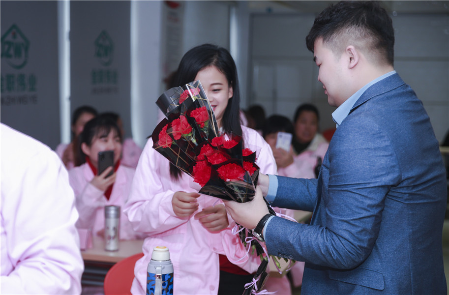 紧接着,总经理潘建明携全体男职工为在座每位女性送上鲜花和祝福,祝愿她们生活幸福美满,青春永驻。