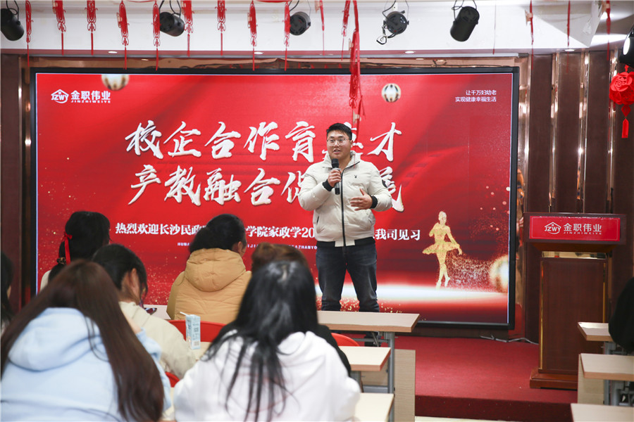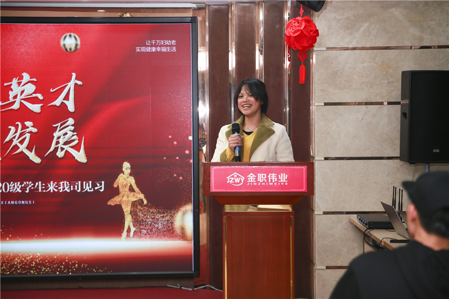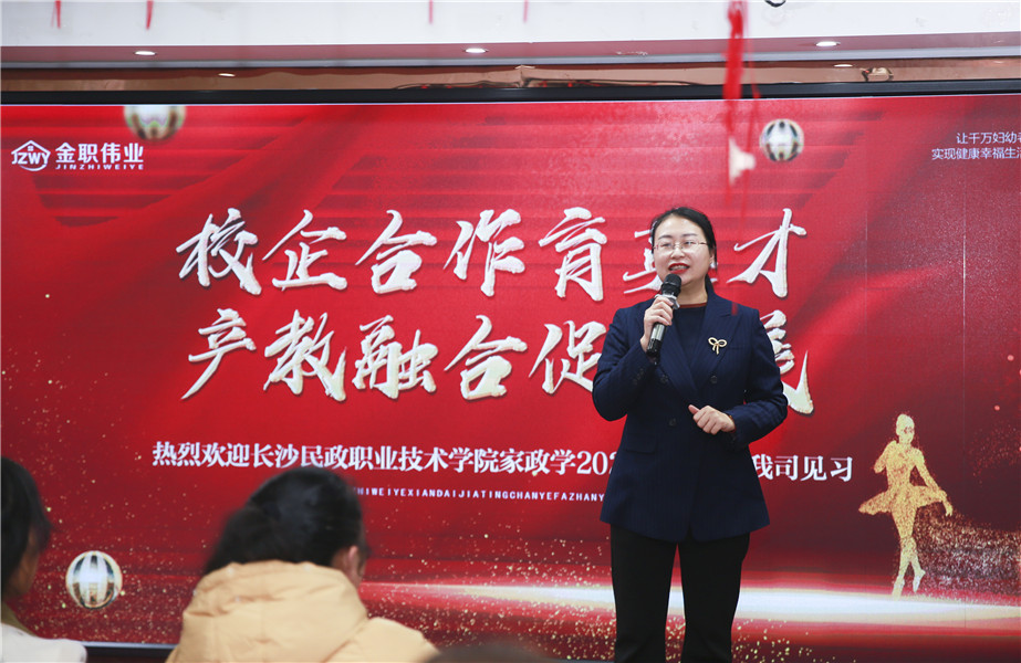 活动伊始,金职伟业培训学校副校长陈万方进行发言。她首先对在座的90余位家政学学生在见习期间的表现表示高度赞扬,“很感谢长沙民政职业技术学院一直以来对金职伟业的大力支持,长期以来,双方进行深度校企合作,不仅建立‘校企合作中心’,打造就业、创业孵化基地,还为我司输送了一批又一批的优秀人才。”最后,陈万方希望学生们在今后能够掌握更多专业知识,不断提升自身综合素养,成为一名合格的家政人。