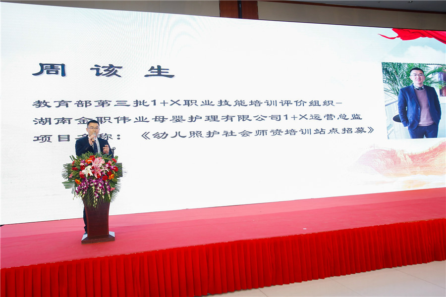 湖南金职伟业集团大市场总监周该生作为教育部第三批1+X职业教育培训评价组织代表,就“教育部1+X幼儿照护职业技能等级证书”项目在会上进行讲解。他首先就1+X幼儿照护职业技能等级证书开发情况、项目优势、工作成效、社会效益、社会师资培训站点招募等方面进行介绍,随后还分享了金职伟业在幼儿照护人才培养中的新思路、新做法,赢得与会专家一致好评。