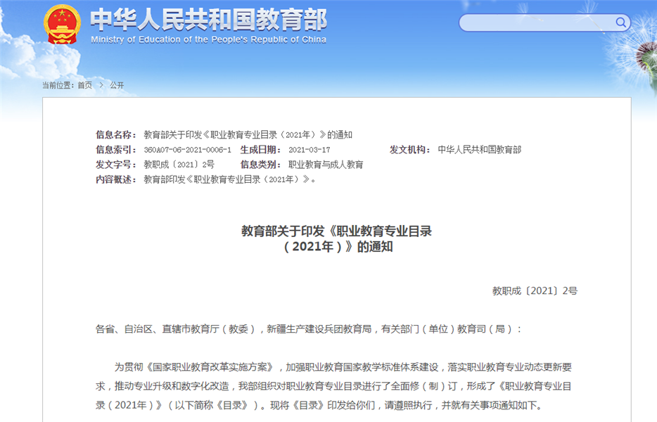 据了解,为加强职业教育国家教学标准体系建设,落实职业教育专业动态更新要求,推动专业升级和数字化改造,3月12日,教育部印发了《职业教育专业目录(2021年)的通知》(以下简称《目录》),《目录》全面落实《国民经济和社会发展第十四个五年规划和2035年远景目标纲要》对职业教育的要求,在科学分析产业、职业、岗位、专业关系基础上,对接现代产业体系,对职业教育专业目录进行全面修(制)订。其中,新增《婴幼儿托育》《婴幼儿发展与健康管理》专业,同时婴幼儿托育服务与管理专业归属调整为健康管理促进类。