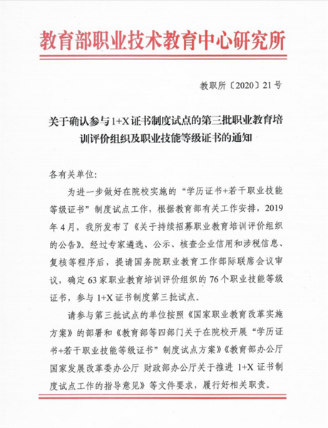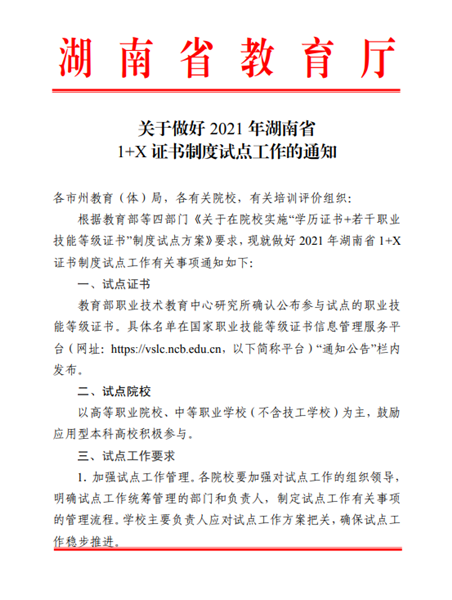 为了稳步推进1+X证书制度试点工作,建立健全工作机制、加强应用研究、鼓励先行先试、注重师资培训,鼓励支持一大批行业影响力大、专业特色鲜明、建设基础较好的院校积极参与试点工作,4月12日,湖南省教育厅下发《关于做好2021年湖南省1+X证书制度试点工作的通知》(简称《通知》)。《通知》指出,2021年首轮试点计划申请提交时间为4月15日至4月30日,1+X幼儿照护、产后恢复职业技能等级证书也可于4月15日同步启动申报。