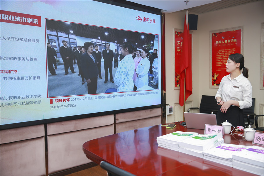 座谈会上,金职伟业市场主管黄以静对公司的品牌战略架构、核心项目、课程体系、加盟模式、1+X幼儿照护和产后恢复职业技能等级证书制度试点工作情况做了相关介绍。