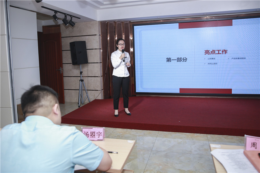 综合部、市场部、外联部、发展事业部、直营门店及门店运营部、品牌运营及商学院各部门负责人,依次上台进行汇报,系统展示了部门在5月份取得的成绩,同时总结工作经验,分析存在不足。分享中,各部门负责人还详细阐述了6月份的部门工作计划,以具体化的工作措施,明确前行任务及必达目标。