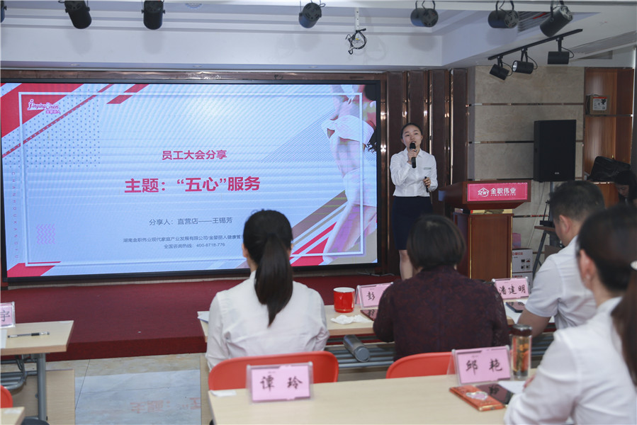 员工分享环节,各部门分别派出优秀代表上台进行工作分享,他们或激情昂扬、或专业严谨、或干货满满,以良好的精神风貌,展现了金职人的专业态度。“我认为做到热心,细心,耐心,暖心,责任心,是做好高质量服务的核心内容,也是创造优质口碑的重要条件。”直营门店王锡芳在分享中细致阐述了她的服务之道。市场部胡诗白在分享中表示,“要坚持勤奋、务实、高效的工作作风,虚心向有经验的同事请教问题,努力完成工作任务,才是一名合格金职人应有的态度。”……各位员工的精彩分享,让台下的金职人纷纷表示受益匪浅、收获颇丰,现场掌声不断。