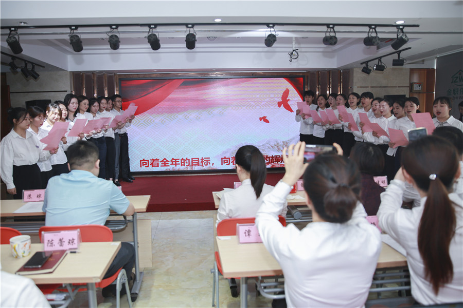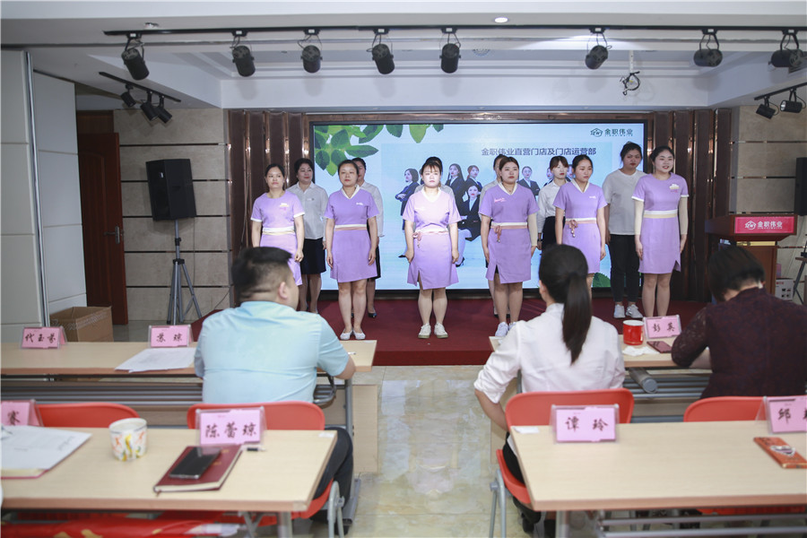 为呈现金职人饱满、朝气、蓬勃、向上的团队精神风貌,各部门纷纷进行了精彩的团队展示,市场部激人奋进的歌曲《金职进行曲》,展现了金职市场人业绩为先、服务至上的专业精神,品牌运营及商学院团队铿锵有力的口号、整齐划一的手语舞,体现了团队专业、严谨的工作作风,直营门店和门店运营部标准的服务礼仪展示,外联部新颖独特的无沟通搭建纸塔,综合部、发展事业部一声声响亮的口号,无一不彰显了团队无穷的力量。
