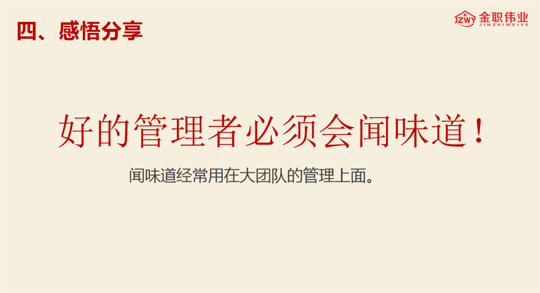 闻味道:观察员工的情绪、氛围,从中找到正面负面的信息。你要比别人更敏感地发现尚未萌芽的问题,它既代表你对未来的判断,也代表你个人在灵魂、哲学、精神上的思考。