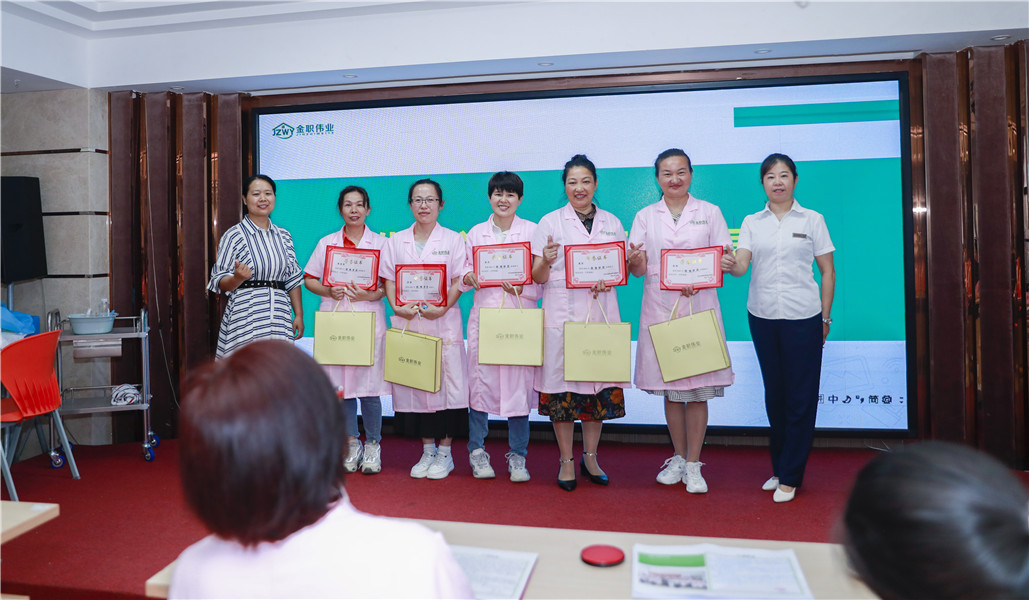 随后,为认真负责的班干部及表现良好的学员颁发荣誉证书。肖宏、余圣君荣获“优秀班干部”称号;黄华、吴培、彭丹、张金秀、罗丽荣获“优秀学员”称号。获奖时,她们均表示,很感谢政府与金职伟业提供珍贵的学习机会,定会充分运用养老护理专业知识及技能,服务好每一位老人。