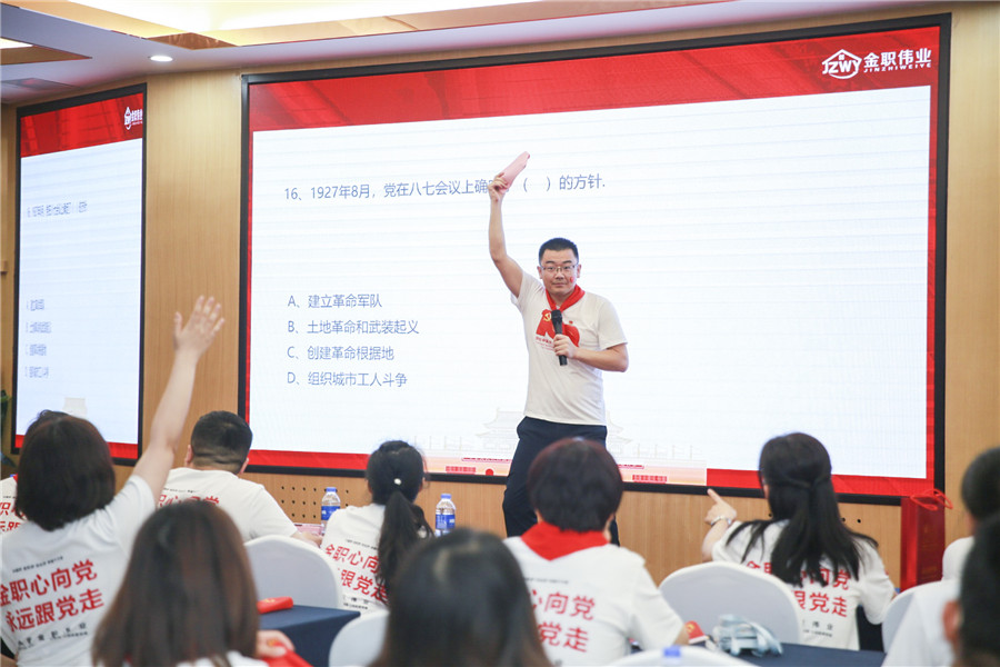 “红军长征途中召开的什么会议,确立了毛泽东在党中央和红军的领导地位,挽救了党、挽救了红军、挽救了中国革命,成为党的历史上一个生死攸关的转折点?开始抢答!”“遵义会议!”本次活动大会特别举行了党史知识有奖问答,现场气氛堪比盛夏的骄阳,气氛热烈、欢声笑语、掌声不断;现场观众斗志昂扬、互动频繁,纷纷踊跃参与知识竞答,答题准确,淋漓尽致展现了党史学习教育的丰硕成果。通过本次党史知识竞赛,进一步加深了大家对党的了解和认识,激励了广大党员干部群众解放思想,与时俱进,以更饱满的工作热情、更敬业的工作态度、更务实的工作作风投入到工作中。