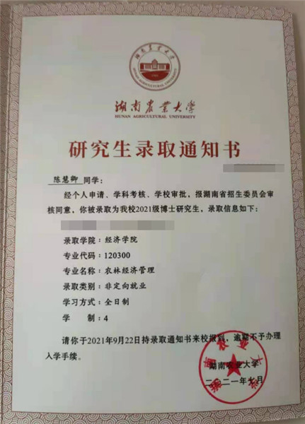 热烈祝贺金职伟业发展事业部陈慧卿考取湖南农业大学博士