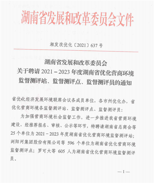 金职伟业获评2021-2023湖南省优化经济发展环境监督测评点