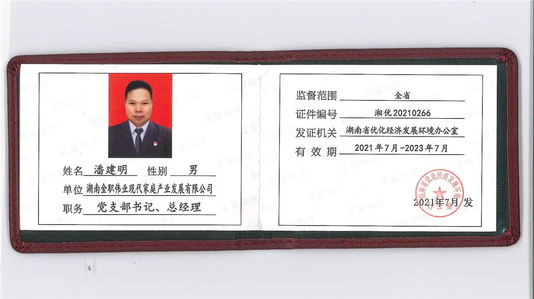 良好的环境是湖南经济发展的“生命线”,是区域综合竞争力的核心,优化经济发展环境的重要性不言而喻。2021年7月,湖南金职伟业现代家庭产业发展有限公司(下称“金职伟业”)从全省上百万家企业中脱颖而出,被湖南省优化经济发展环境办公室选定为湖南省优化经济发展环境监督测评点,湖南金职伟业现代家庭产业发展有限公司党支部书记、总经理潘建明被选定为湖南省优化经济发展环境监督测评员。此举,旨在充分发挥省优化经济发展环境监督测评站、点、员的监督作用,进一步完善优化经济发展环境工作监管机制,畅通信息反馈情况。