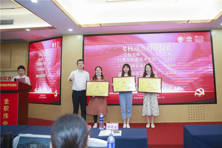 现场,金职伟业市场总监周该生为新一批考核站点院校代表进行授牌,分别是:昌都市职业技术学校、广西梧州农业学校、湖南省中南艺术学校、通渭县职业中等专业学校、重庆市女子职业高级中学、重庆文化艺术职业学院、彭水苗族土家族自治县职业教育中心。同时,还为表现优异的优秀班干部及优秀学员颁发了荣誉证书。