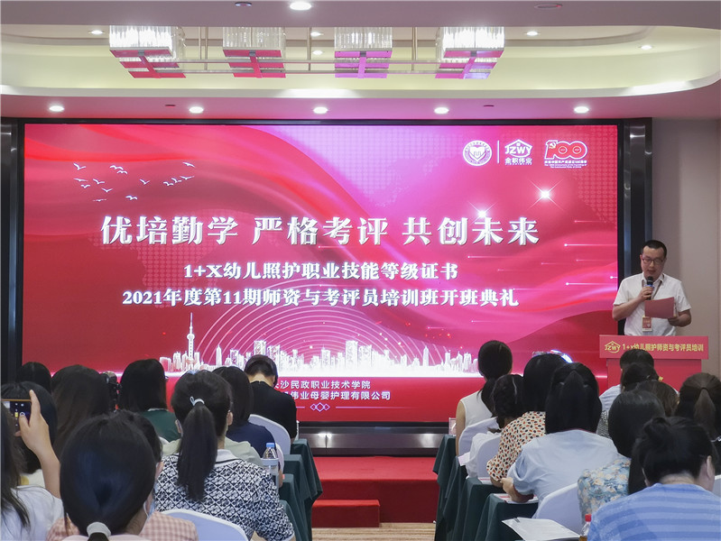 金秋九月,暑气未散。为全面落实《关于在院校实施“学历证书+若干职业技能等级证书”制度试点方案》的通知,高质量开展1+X幼儿照护职业技能等级证书制度试点相关工作,提高院校开展幼儿照护证书试点工作的整体师资水平,全面提升证书教育培训质量,9月24日上午,1+X幼儿照护职业技能等级证书2021年度第11期师资及考评员培训于湖南长沙火热开班,来自全国各大院校的百余名专家、老师齐聚一堂,共同学习幼儿照护专业知识及技能,探讨托幼托育事业未来发展前景。