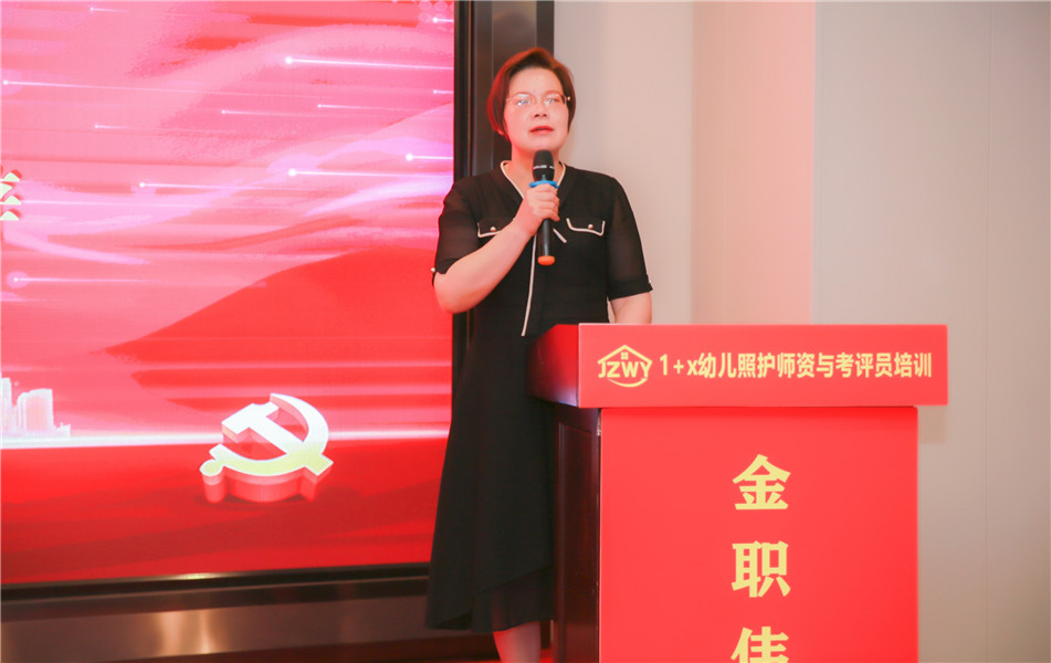 典礼伊始,长沙民政职业技术学院继续教育学院孙锋院长、金职伟业董事长彭英率先发表致辞。孙院长提到,国家高度重视幼儿照护等社会服务领域的人才培养,推动幼儿照护领域1+X证书制度落地,在教育、人才、产业方面,发布了一系列配套政策,作为职业院校应抓住机遇,加快推进人才培养模式的改革;一线教师应该深入研究幼儿照护职业技能等级标准,在课堂教学、课程标准制定、教材研发等方面融入标准,让学生能牢固掌握此项技能,为将来适应职业岗位需求做好准备。长沙民政职业技术学院作为首批职业教育1+X证书制度推进试点单位和双高校建设单位,定会全力支持金职伟业的培训工作。彭英董事长从国家政策、1+X证书工作成果、未来发展等多方面进行全方位阐述,其中重点提及,国家支持各地中、高职开展1+X证书制度试点,并匹配相对资金补贴,对于提升各大院校相关专业学子技能水平、拓宽就业渠道有重要意义。金职人拥抱伟大教育情怀,不断协助试点院校开展证书培训与幼儿照护人才培养工作,持续推动“岗、课、赛、证”融通,全面助力幼儿照护领域的复合型技能人才培养。
