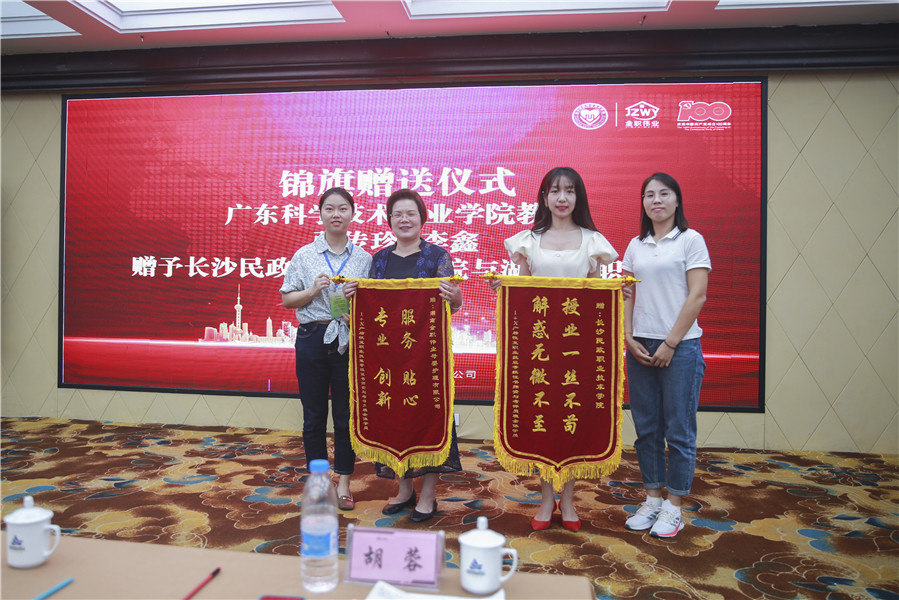 而后,学员代表广东科学技术职业学院张传珍老师、李鑫老师为长沙民政职业技术学院、湖南金职伟业母婴护理有限公司赠予锦旗。锦旗鲜红,数语寥寥,却情深意重。同时,湖南金职伟业1+X产后恢复项目委员会为本期优秀班干部、优秀学员以及教师教学能力竞赛特聘专家评委颁发证书。