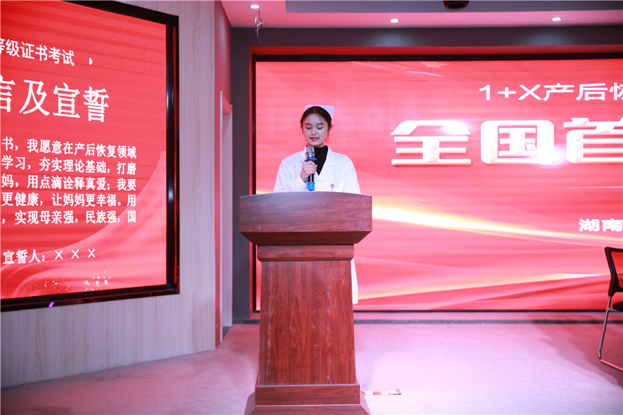 荆州职业技术学院1+X产后恢复教学团队成员袁朦,作为此次考试的考评员代表进行发言。她希望,每位参考的学生都能够在考场上展现出最佳的状态,真正让专业知识融入实操技能,为产后恢复行业的美好明天添砖加瓦。铮铮誓言道真心,庄重承诺表决心。“我愿意在产后恢复领域燃烧我的青春,绽放我的能量……”在考生代表杜婉萍同学的带领下,全体考生共同宣誓。新时代、新技能、新梦想!这注定是一个浸透汗水的赛场,一次书写光荣的比拼。每位考生,都将在此次考试中印下奋斗的足迹!