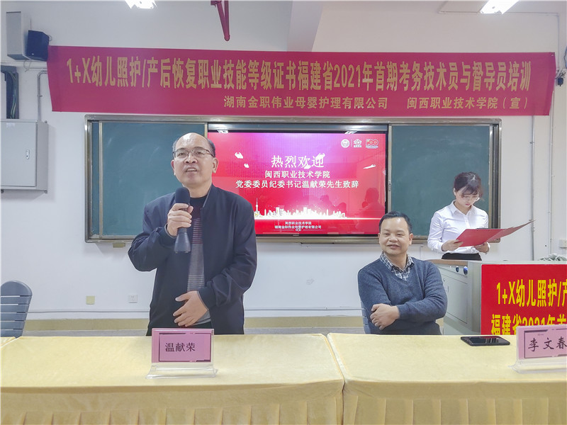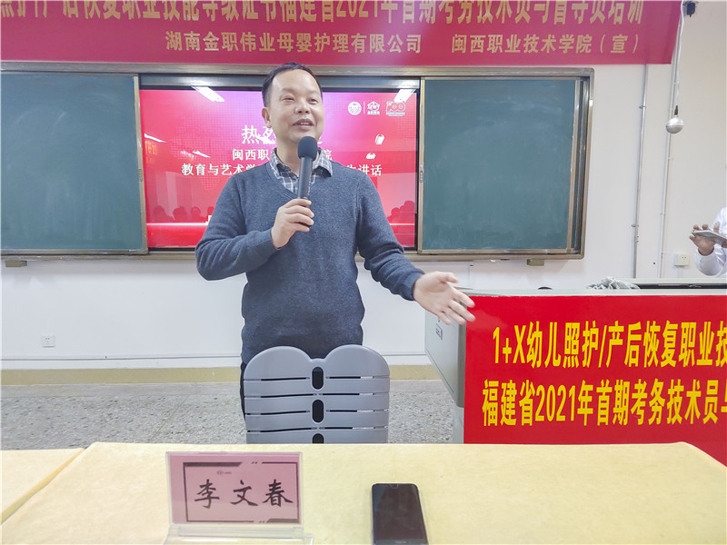 闽西职业技术学院纪委书记温献荣和闽西职业技术学院教育与艺术学院院长李文春发表讲话。刘路永认为,考务技术员和督导员的技术支持是幼儿照护考评工作顺利进行的关键,幼儿照护之路任重道远,考务技术员和督导员们也要树立终身学习的观念,为幼儿照护的光明未来共同努力。李文春对参训教师寄予厚望:“希望各位老师都能成为1+X幼儿照护、产后恢复职业技能等级证书的传播者,践行者,谨记使命,快速推动1+X幼儿照护、产后恢复职业技能等级证书在学校的落地,为托育、产后恢复行业培育更多高素质的技术技能型人才。”