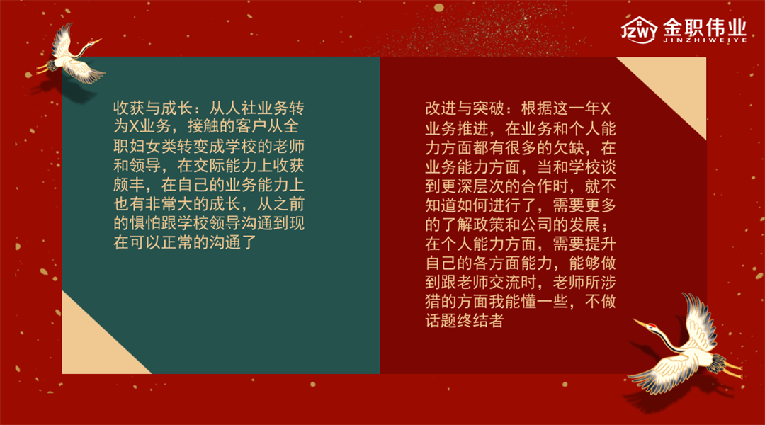 “金职伟业是一个可以实现梦想和自我价值地方,很庆幸能在各位领导的带领下,做出如今的成绩,相信2022年,公司将实现跨越式发展。”外联部徐燕自入职以来一直在工作岗位上兢兢业业,热心服务每一位学员,是部门名副其实的业绩冠军。“2021年,我在肩负招生工作同时也负责所有职业技能提升培训工作的开班、补贴材料申报工作。今后,我将在业务上不断学习,优化培训工作方案,抓重点抓细节,以昂扬斗志吹响新一年的号角。”外联部熊丽萍谈道。