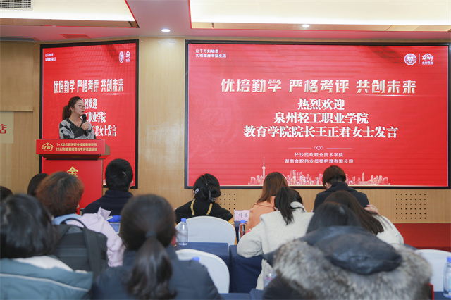 现场,湖南省育婴师协会会长、金职伟业集团总经理潘建明就金职伟业家庭服务产业学院基本情况、典型案例、建设思路、建设目标、社会效益等方面做了详细说明,他提到,金职伟业家庭服务产业学院将创新高素质技能型人才培养模式。设计真实场景,定制技能强化项目、操作流程及对应考核标准开发仿直综合技能训练项目软件,构建“虚拟仿直+模型辅助+真人对练+考核评价”的实验教学体系。其次,树立标杆,打造职业教育示范品牌。依托基地开放共享的特色和社会化服务机能,在建设健康产业同时,结合学校实际,改革创新,打造区域职业职业教育示范品牌。最后,创新推动“双高”建设服务行业。依托行业、学校等主体间搭建起协作机制,实现产学研一体化、实现科学研究、学生培养与服务社会的统一。