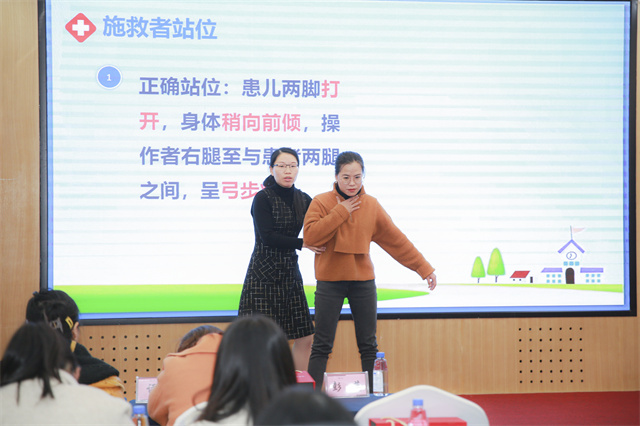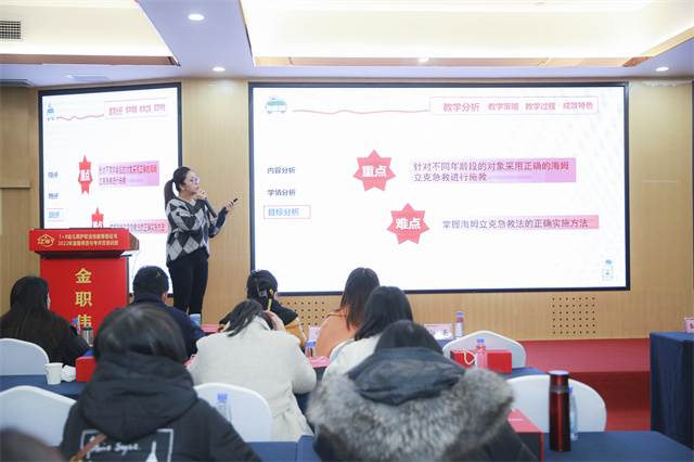 生活中呼吸道被异物堵塞的情况并不少见,尤其是家里有小孩的家庭,经常吃东西被呛到,有时候甚至情况紧急、威胁生命,这时候就要求我们掌握一些急救技巧。庄妮娜为代表的第四组以《海姆立克急救法》为主题,理论结合实践,分步骤、有条理展示了海姆立克急救法的具体操作流程和重点注意事项,老师们以精彩的解说及娴熟的手法,最终夺得桂冠。同时,以苏布德、丁洁、王虎林为代表的第一组、二组、五组获得竞赛三等奖,以杨永芳、韩舒姝为代表的第三组、六组获得竞赛二等奖。