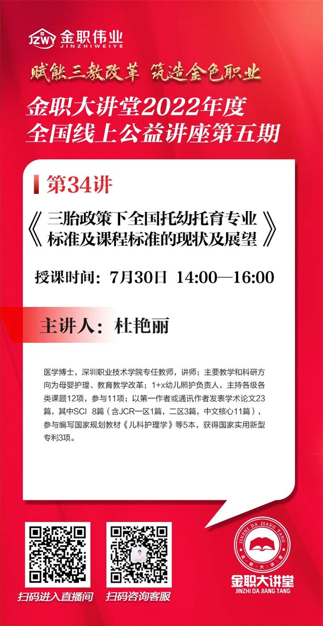 7月30日,金职大讲堂将开启第五期第34讲,此次课程邀请了深圳职业技术学院杜艳丽老师就《三胎政策下全国托幼托育专业标准及课程标准的现状及展望》进行主题授课。届时,诚邀各位行业专家、院校老师共同参加与聆听~