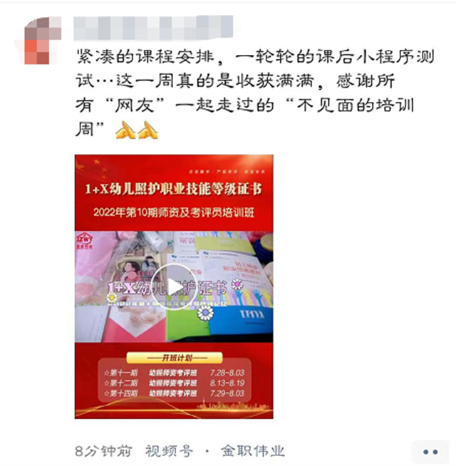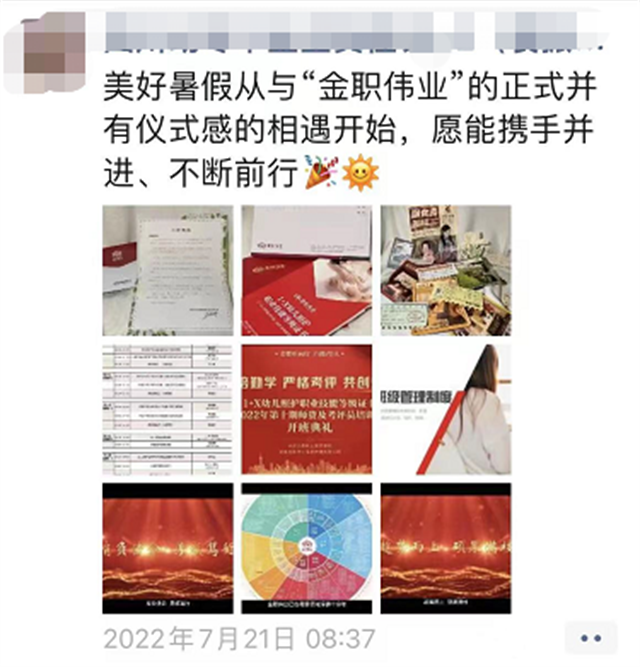 据了解,此次培训为期七天半,全程以线上形式进行,为确保线上技能学习效果不打折,金职伟业结合线上教学特点,融入信息化教学,科学化设置实操及考评管理,同时提前录制实操示范视频、整理实操示范话术,上传至金职母婴官网,以老师们观看和学习,获得了广泛认可。截至结业当天,学员线上跟课率100%,考核及格率100%。