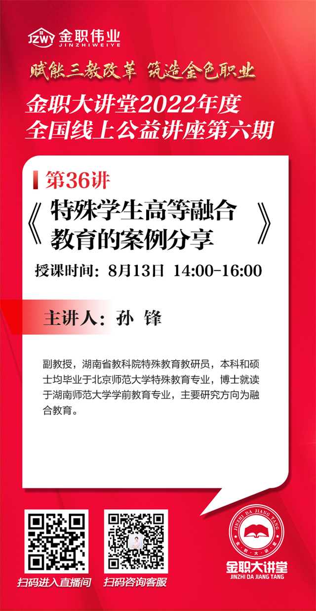 8月13日,金职大讲堂将开启第六期第36讲,此次课程邀请了湖南省教科院孙锋副教授就《特殊学生高等融合教育的案例分享》进行主题授课。届时,诚邀各位行业专家、院校老师共同参加与聆听~