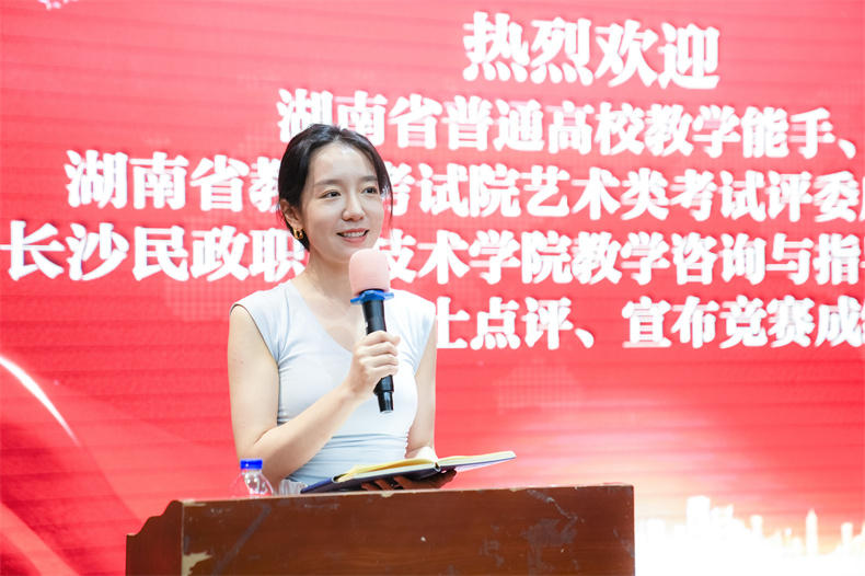 随后,评委专家从内容设计、语言教态及思政融合等方面进行评分。长沙民政职业技术学院教学咨询与指导团队专家、湖南省教育考试院艺术类考试评委库专家胡蓉作为代表进行现场点评,她就教学模式、教学步骤、教学资源、教学评价、课程思政五点进行分享,并强调教学资源不应局限于信息化资源,还应包括教师团队、教学环境等要素。
