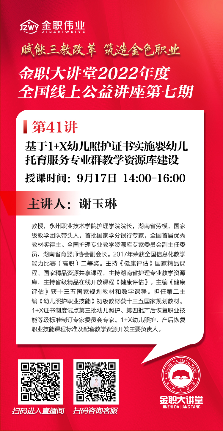9月17日,金职大讲堂将开启第七期第41讲,课程将邀请到永州职业技术学院护理学院院长谢玉琳教授就“基于1+X幼儿照护证书实施婴幼儿托育服务专业群教学资源库建设”进行主题授课。届时,诚邀各位行业专家、院校老师共同参与、聆听~
