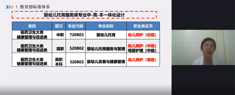 谢玉琳教授率先就新版《简介》中中职“婴幼儿托育”,高职“婴幼儿托育服务与管理”,高职本科“婴幼儿发展与健康管理”专业的职业面向、培养目标定位、主要专业课程与实习实训作了详细解读。“1+X幼儿照护职业技能等级证书分初、中、高三个等级,涵盖生活照料、安全防护、早期发展、特殊照护、入户指导等模块,与婴幼儿托育相关专业相匹配,被列入了多个专业职业类证书举例。”
