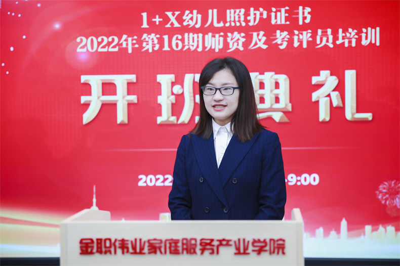 幼儿照护事业的发展离不开高素质技能人才队伍的建设,作为人才培育的重要一环,职业教育教师肩负重任。开班典礼伊始,金职伟业董事长助理兼品牌运营总监周娟表示,推进“岗课赛证”综合育人模式,有望从根本上实现职业教育改革,从而真正培养出一大批应用型、复合型、创新型的高素质技术技能人才。她希望能与各位专家老师共同探讨、践行,赋能幼儿照护人才培育,助推幼儿照护事业蓬勃发展。