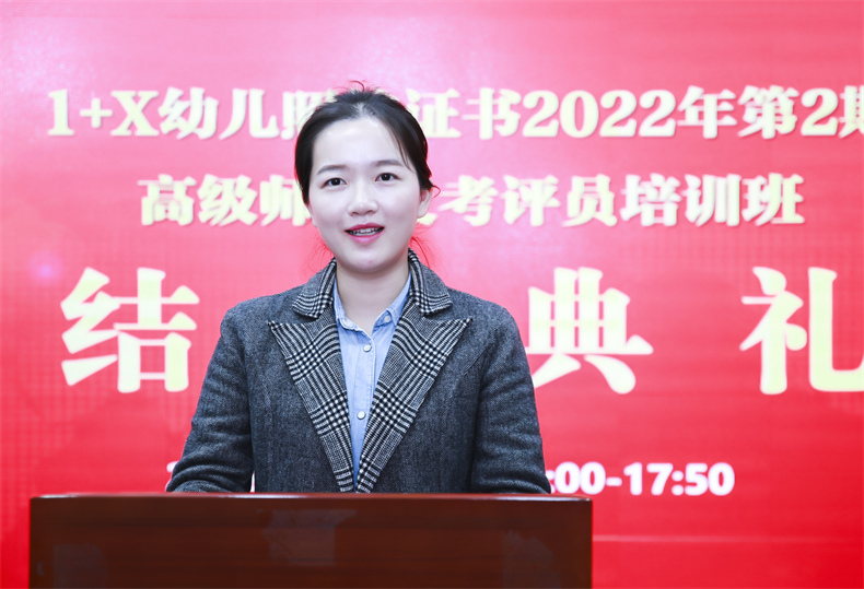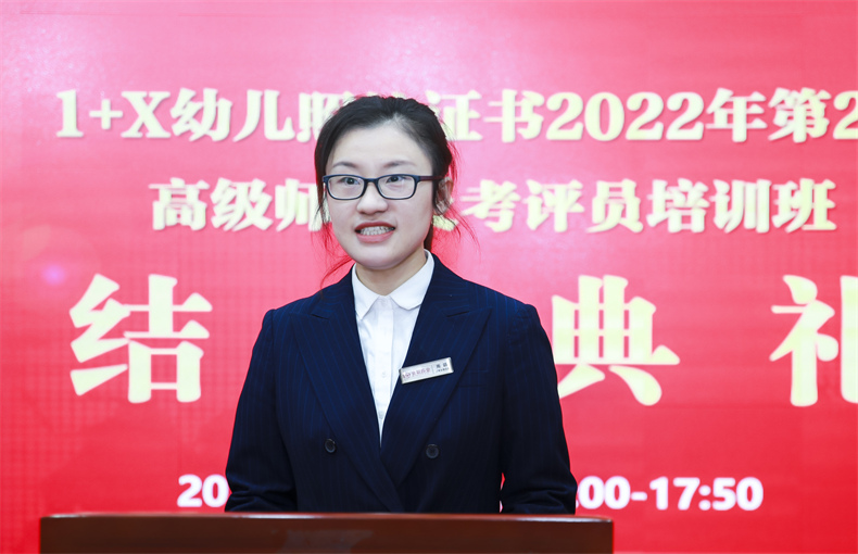 重庆市农业学校现代农业系幼儿保育专业陈瑞春主任作为学员代表发言,“我校组织开展1+X幼儿照护职业技能等级证书考试三年,从无标准幼儿照护实训室到成为示范考核站点,从以幼儿教育方向课程为主的教学方式到初步实现岗课赛证融通,金职伟业开展的师资与考评员培训功不可没。”她表示,推进1+X幼儿照护职业技能等级证书考评工作是学校建设幼儿保育专业的一大重要举措,希望能与金职伟业以及其他院校加强联系,在示范考核站点建设、优秀案例打造、课证融通体系搭建、课程开发、校企合作等各方面通力合作,为培养出一支高质量的幼儿照护专业人才队伍助力。