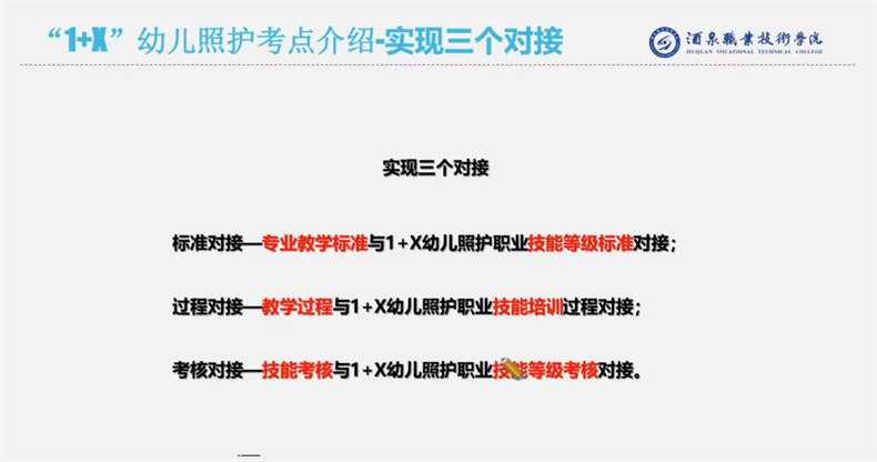 随后,蔺燕主任介绍了酒泉职业技术学院1+X证书制度试点工作情况。“学校自2020年4月成为1+X证书制度试点院校以来,多次选派教师参与1+X幼儿照护职业技能等级证书师资与考评员培训,并积极申报为考核站点。”蔺燕主任强调,1+X证书制度试点工作的推进,有助于专业教学标准与岗位标准、职业技能标准对接,促进教学链与岗位链的深度融合,推进课程体系和课程内容的改革,是职业院校学前教育专业建设与人才培养的重要路径。