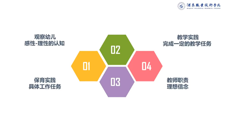 “推进产教融合、校企协同育人的实践教学体系,对学前教育专业建设有着重要的现实意义。基于此,我对当前学前教育专业校企合作模式的实施现状展开了分析,并对协同育人路径的构建与发展进行了全面探索。”课上,蔺燕主任剖析了当前学前教育专业建设亟待解决的问题,并以酒泉职业技术学院为例,深入阐述了学校学前教育专业对接行业产业的方法与路径。