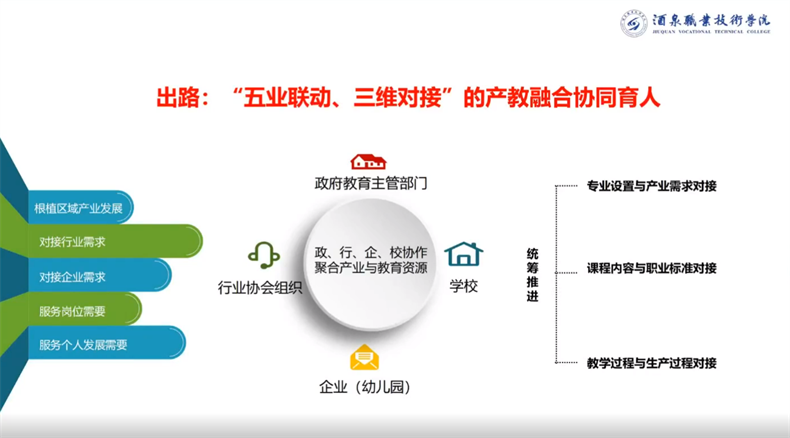 蔺燕主任表示,要通过产业、行业、企业、职业与专业五业联动,聚合产业与教育资源,统筹推进专业设置与产业需求对接,课程内容与职业标准对接,教学过程与生产过程对接,实现产教融合,校企共育人才。“职业教育侧重实践技能与工作能力的培养,目前学校与幼儿园区共建实训基地,学生轮岗实习,在实践中加强了育人的针对性与实效性。”