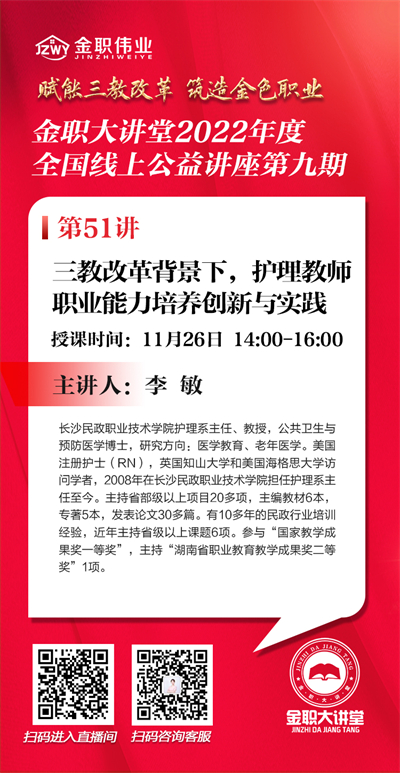 11月26日,“金职大讲堂”将开启第九期第51讲,课程将邀请长沙民政职业技术学院护理系李敏主任就“三教改革背景下,护理教师职业能力培养创新与实践”进行主题授课。届时,诚邀各位行业专家、院校老师共同参与。