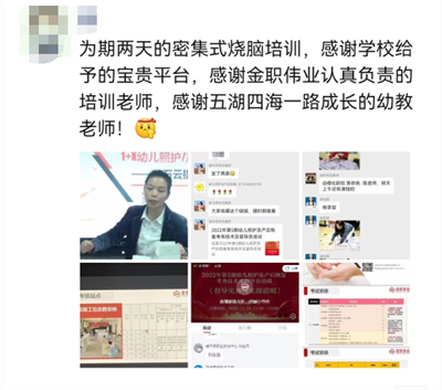“本次线上学习,既有观念上的洗礼,也有理论上的提高;既有知识上的沉淀,也有教学技艺上的增长。”安徽中医药高等专科学校护理系护理专业实验员李叶老师表示,作为一名教师,她将把这份专业和责任心传播下去,为我国教育事业的发展添砖加瓦,为幼儿照护人才培养贡献更多力量。南宁市西乡塘区红十字会一级主任科员何卓姿老师谈道,经过此次培训,她深切地感受到了金职伟业的专业能力,“在有视频、有文字、有理论、有实践的生动课堂中,我们全体参训教师积极参与、认真领悟,真心收获满满。”
