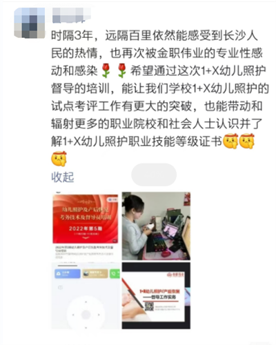 晋中师范高等专科学校刘海芳副教授作为金职伟业的老朋友,曾于2021年5月参加了1+X幼儿照护职业技能等级证书师资及考评员培训,为期一周的培训,让她收获颇丰。“那次培训让我被金职伟业的专业性所折服,围绕幼儿照护职业技能等级证书,他们从生活照料、日常保健、早期发展等维度,开发了实用性满满的课程,尤其是核心技能的操作实践性、针对性非常强,对于学生将来就业有极强的帮助。”刘海芳副教授希望,通过这次考务技术及督导员培训,快速推进1+X幼儿照护职业技能等级证书的落地,助力学生就业创业。