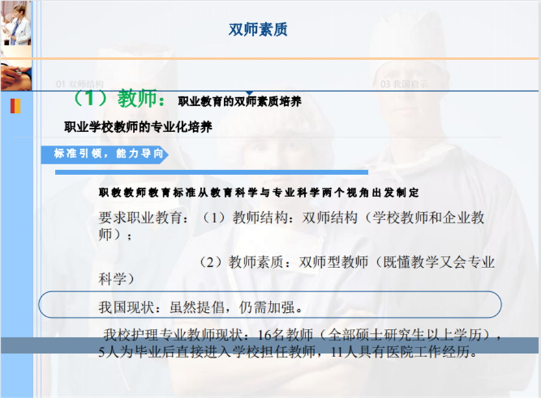 在教师方面,李敏教授提到,职教教师教育标准从教育科学与专业科学两个视角出发制定,要求职业教育教师结构为双师结构,即同时配备学校教师和企业教师;教师素质为双师型教师,既懂教学又会专业。“我校护理专业教师现状为16名教师(全部硕士研究生以上学历),5人为毕业后直接进入学校担任教师,11人具有医院工作经历。”