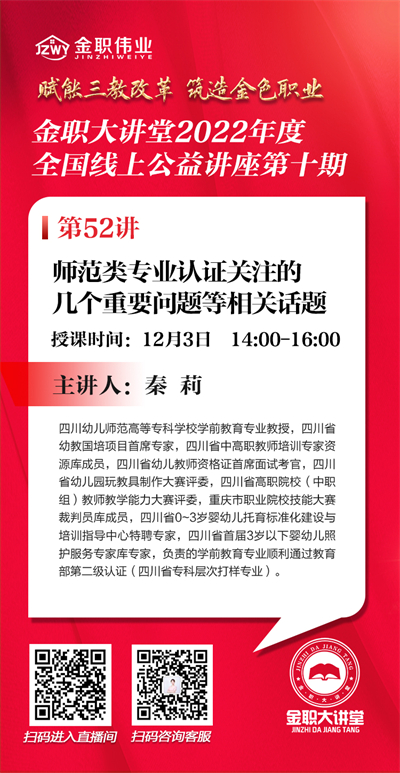 12月3日,金职大讲堂将开启第十期第52讲,课程将邀请四川幼儿师范高等专科学校学前教育专业秦莉教授就“师范类专业认证关注的几个重要问题等相关话题”进行主题授课。届时,诚邀各位行业专家、院校老师共同参与。