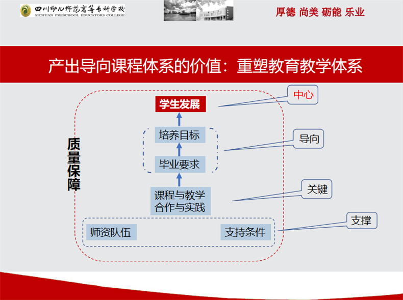秦莉教授提到,成果导向教育理念在于教学设计和教学实施的目标,是学生通过教育过程最后所取得的学习成果。它强调四个问题:是什么、为什么、如何帮助、如何知道;强调四个实施原则:清楚聚焦、扩大机会、提高期待、反向设计;五个实施要点:确定学习成果、构建课程体系、确定教学策略、自我参照评价、逐级达到顶峰。