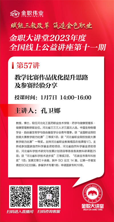 1月7日,金职大讲堂将开启第十一期第57讲,课程将邀请河北化工医药职业技术学院孔卫娜教授就“教学比赛作品优化提升思路及参赛经验分享”进行主题授课。届时,诚邀各位行业专家、院校老师共同参与。