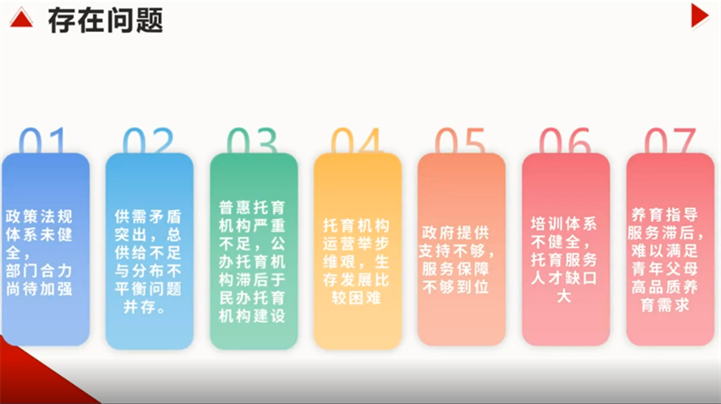 基于此次研究,吕文静副教授认为,目前托育行业发展存在以下七点问题:一政策法规体系未健全,部门合力尚待加强;二供需矛盾突出,总供给不足与分布不平衡问题并存;三普惠托育机构严重不足,公办托育机构滞后于民办托育机构建设;四托育机构运营举步维艰,生存发展比较困难;五政府提供支持不够,服务保障不够到位;六培训体系不健全,托育服务人才缺口大;七养育指导滞后,难以满足青年父母高品质养育需求。