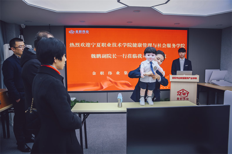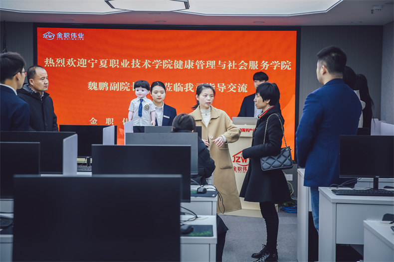 2月16日下午,宁夏职业技术学院健康管理与社会服务学院副院长魏鹏一行莅临金职伟业考察交流,金职伟业总经理潘建明等热情接待,双方就如何深化校企合作,共育技能人才展开了深入探讨。