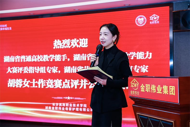 金职伟业还特邀湖南省普通高校教学能手、湖南省职业院校教学能力大赛评委指导组专家,湖南省艺术类考试评审专家胡蓉对本次竞赛作专家点评,胡蓉老师以自身经历给出相应建议,她强调,教学过程中要凸显职业教育的类型特征,要做到教学情境对接工作岗位,教学方法注重学生的主题地位,教学示范彰显双师素养,以增强学生学习积极性,提高教育质量。