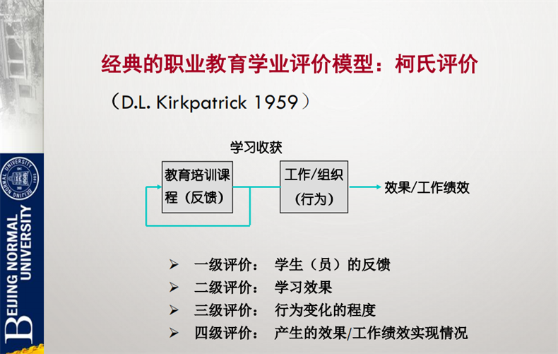 职业教育是赋予学习者从事某种职业性工作所需能力的教育,其学业评价必须考虑教学内容与职业活动之间的紧密联系,因此,职业教育学业评价的对象不仅包括学习收获,也涉及学习者在企业工作中的绩效水平。对此,赵志群教授详细讲解了经典的职业教育学业评价模型:柯氏评价。其围绕培训过程中的反应、学习、行为和结果四方面,确定了职业教育学业评价的四个基本层次:一级评价:学生(员)的反馈,课程结束时进行学生满意度调查;二级评价:学习效果,通过学习过程记录、学习结果测试等方式对课程目标的达成情况进行确认;三级评价:行为变化的程度,在学习结束一段时间后进行,确定学习者行为转变的程度;四级评价:产生的效果,调查学习者因参加教育培训后实现的最终结果,如对口就业率调查和毕业生发展跟踪调查。
