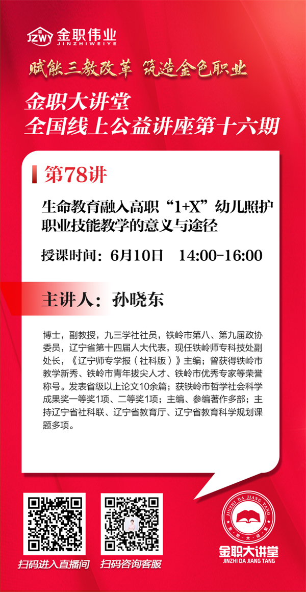 6月10日,金职大讲堂将开启第十六期第78讲,课程将邀请铁岭师范高等专科学校孙晓东副教授,进行《生命教育融入高职“1+X”幼儿照护职业技能教学的意义与途径》主题授课。届时,诚邀各位行业专家、院校老师共同参与。