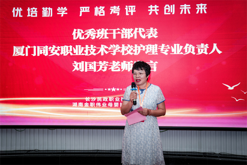 7月9日,1+X幼儿照护职业技能等级证书2023年第一期高级师资及考评员培训班圆满落幕,大连市金州区中等职业技术专业学校学科带头人孙煜,厦门同安职业技术学校护理专业负责人刘国芳,金职伟业集团有限公司总经理潘建明、院校事业部副总监易斌出席结业典礼并讲话。