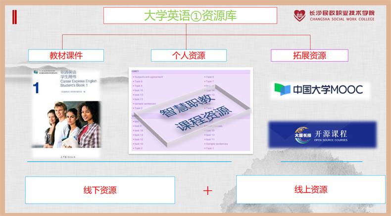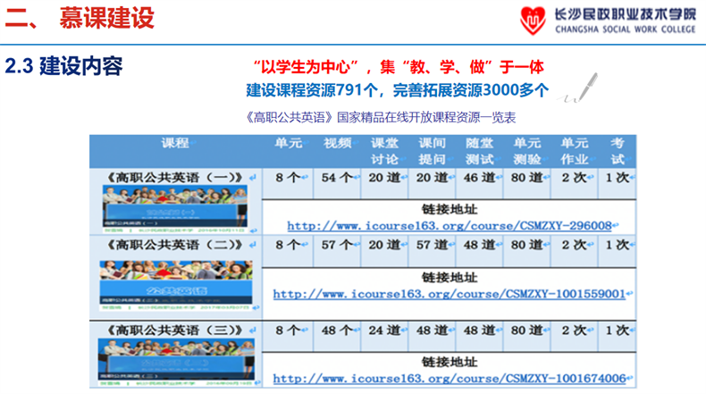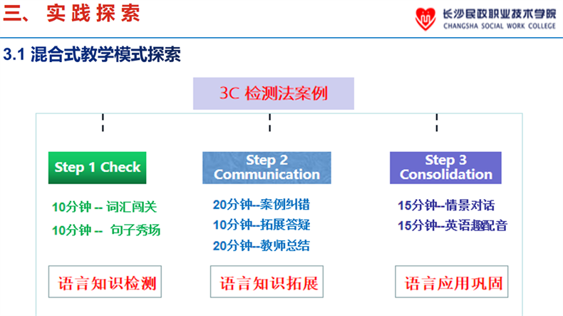 “在线课程资源的建设与应用,是当前职业院校内涵建设的重要抓手,也是提高人才培养质量的重要途径。如何利用‘互联网+’等现代信息技术,促进职业教育资源共享,推动教学方式方法改革,是我们职业院校一直思考的问题。”此次课程分为两部分,金钏主任聚焦长沙民政职业技术学院国家级精品开放课程《高职公共英语》的建设与应用情况,详细讲解了教学资源融入现代信息技术的一体化建设路径,胡兵老师则作了3C检测法课堂教学展示。