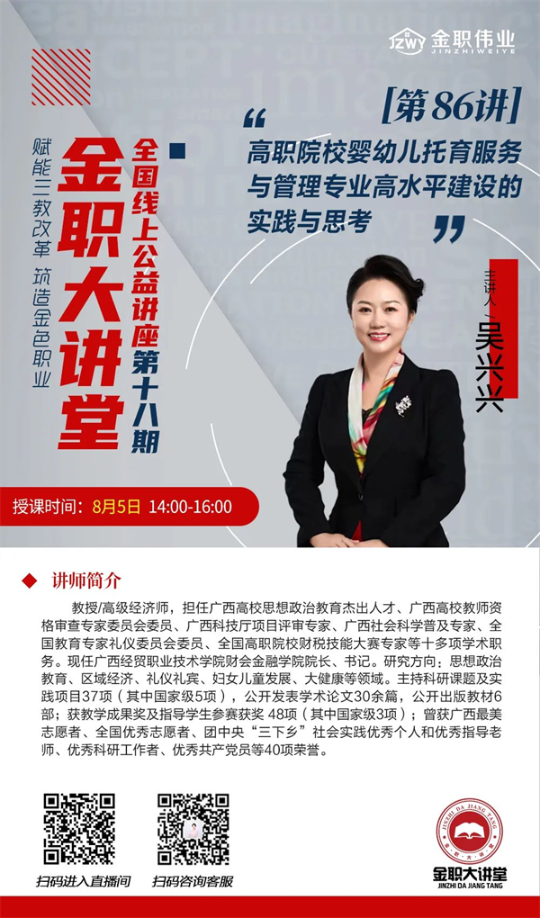 8月5日,金职大讲堂将开启第十八期第86讲,课程将邀请广西经贸职业技术学院吴兴兴教授,进行《高职院校婴幼儿托育服务与管理专业高水平建设的实践与思考》主题授课。届时,诚邀各位行业专家、院校老师共同参与。